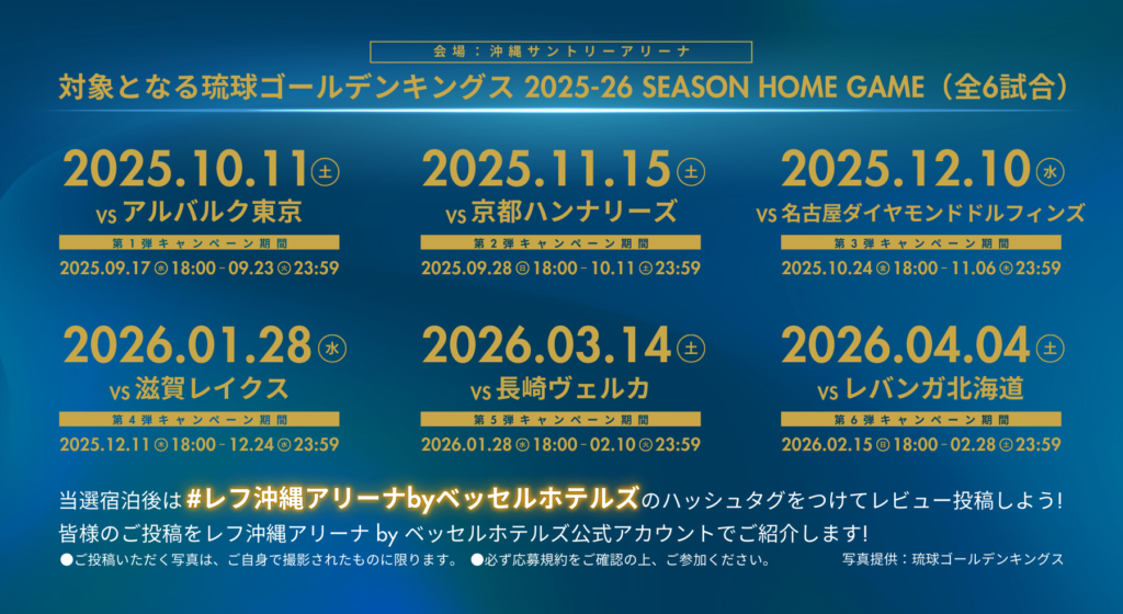 レフ沖縄アリーナ by ベッセルホテルズ(以下「当ホテル」といいます。)が実施する「Cheer Loud, Rest Easy ~観て・泊まって・楽しもう!Wプレゼントキャンペーン~」(以下、「本キャンペーン」といいます。)へ応募を希望される方は、このキャンペーン規約(以下「本規約」といいます。)をよくお読みいただき、同意のうえ応募してください。本キャンペーンに応募された場合には、本規約に同意したものとみなします。万が一同意いただけない場合は応募を中止してください。