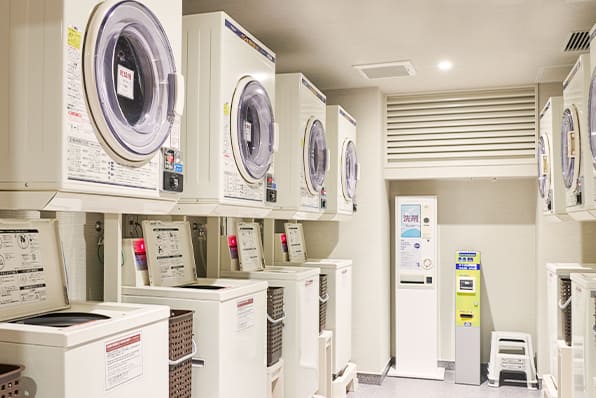 2階に24時間利用可能なランドリーコーナーがあります。クリーニングサービスもあり、長期滞在に便利です。