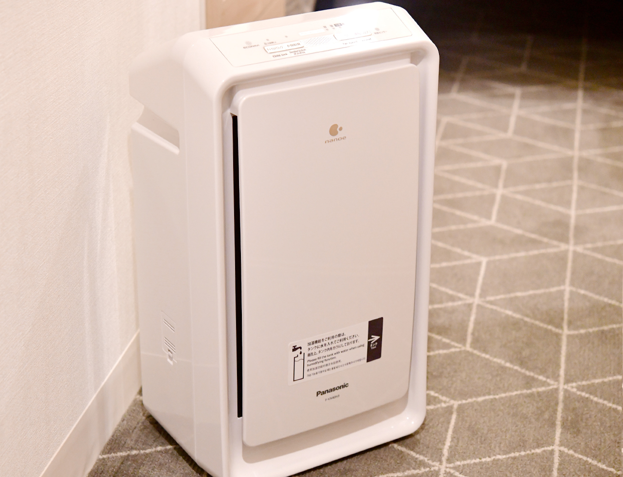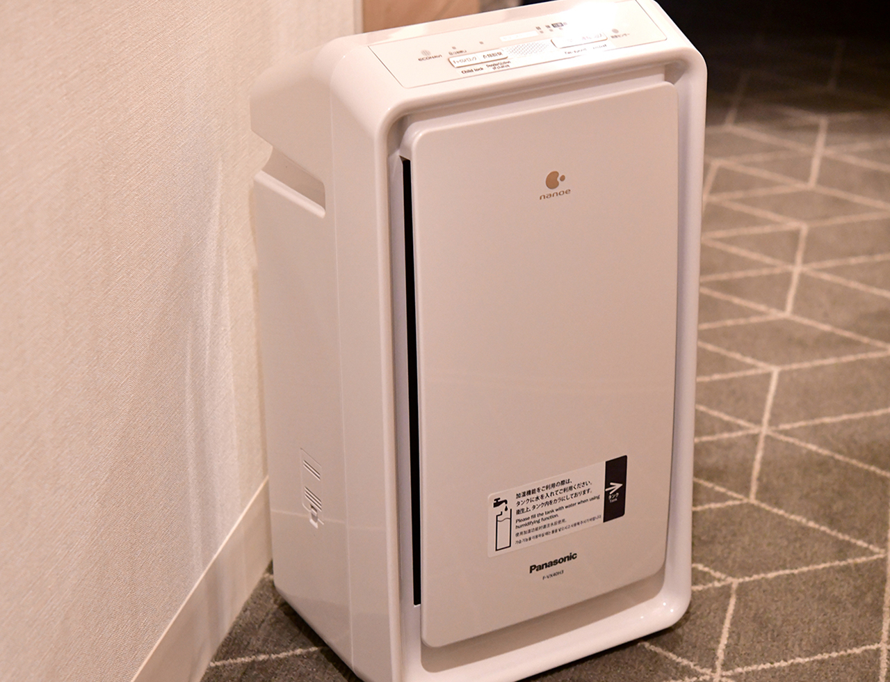 お部屋の中の空気をクリーンに保つ加湿機能付空気清浄機を全室に導入しております。