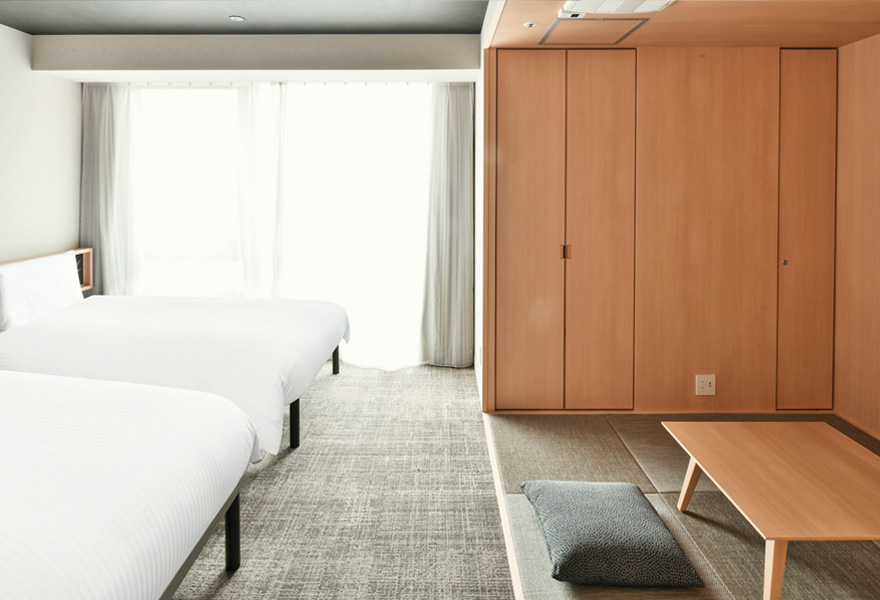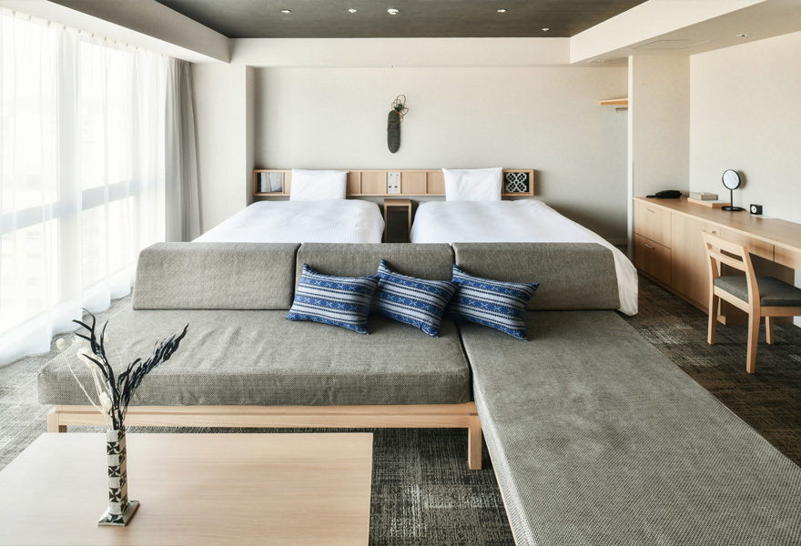 部屋の中では「靴を脱いで」素足でお過ごしいただけます。自宅のように床に座ってのんびりおくつろぎください。